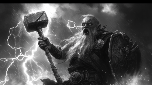 Warhammer style drawing of a dwarf shaman wielding a hammer in one hand and a stone shield in the other while lightning strikes around him, Charcoal Art, Cinematic, Black and White, High Contrast, 8K, Super-Resolution, Spotlight --ar 16:9