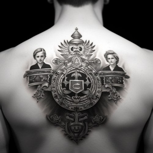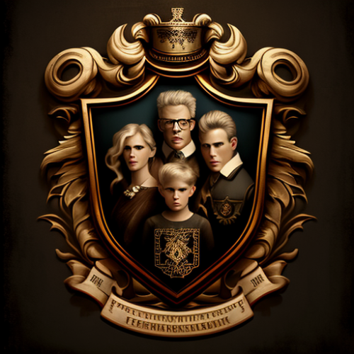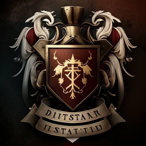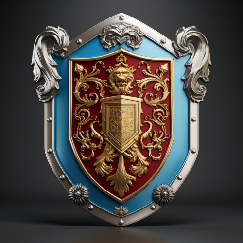 family crest, golden shield with azure border, on the shield a rampant lion stands in heraldic red, surrounded by four silver fleurs de lis in the shape of a cross, photorealistic, 8k, flat background, gleaming steel and gold,