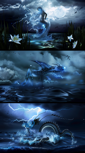 cinematic, portrait photography, An enchanting triptych showcasing the iconic water attribute monsters of the fantasy world. The first scene unfolds with an Undine is a water spirit with a body made of blue and translucent water, gracefully emerging from a serene lake, her form merging with the water, surrounded by moonlit lilies, a true embodiment of healing and devotion. The second cut reveals the fearsome Kraken in the midst of a stormy sea, its tentacles ominously circling a ship, a testament to the ocean's mystery and terror. The final segment captures the Leviathan is sea dragon, its colossal, dragon-like body coiling through the deep sea, lightning flickering around it, symbolizing its dominion over storms and the vastness of the ocean. Each creature is set against a backdrop that reflects its unique essence and power, drawing viewers into the depths of water mythology --ar 9:16 --s 0 --v 6.0 --style raw