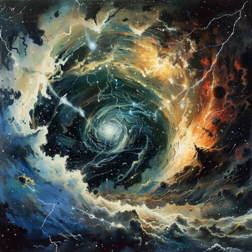 1980s Sci-Fi Art Style, detailed illustration, high contrast: The Galactic Maelstrom, a colossal storm in space, its center a void of utter destruction, surrounded by swirling, colorful gases and lightning strikes.