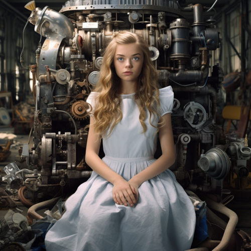 alice in wonderland in a warehouse, many kind of engine parts around her, business core, hyper realistic
