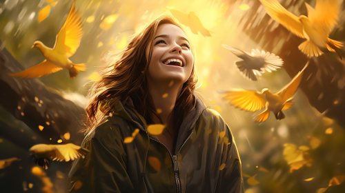girl in hoodie smiling in the pouring rain under warm rays of sunlight, birds flying, swirling leaves, puffy mist, --ar 16:9 --v 5.2