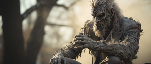man dressed in a lion suit in a cemetery black and white Universal Studios Monster Movie style --ar 7:3 --s 750