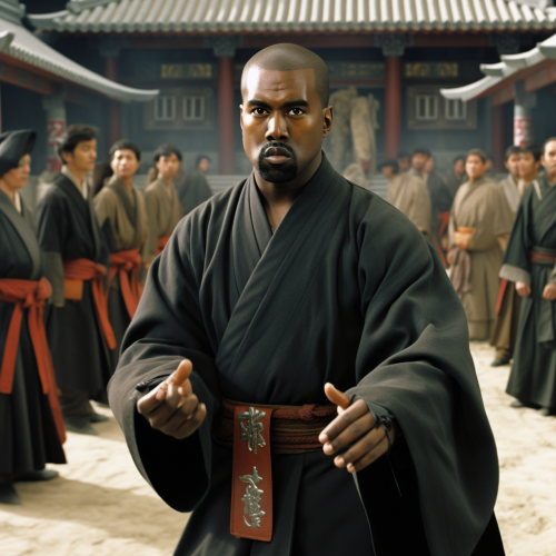 A studio photo of an african american male kung fu character in his early 20s. He is posing for an album cover with his black t-shirt with a teddy bear design on it. His baggy kung fu pants have patches in the shape on an x on them. He has bandages on his hands and on his feet 90s aesthetic. --ar 4:5