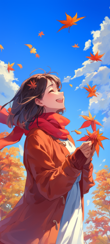 Autumn leaves in Japan, red leaves spreading out in a row, beautiful 25yo girl, smiling, holding autumn leaves in her hands, blue sky, professional photographer with high-performance camera, --ar 9:20 --niji 6