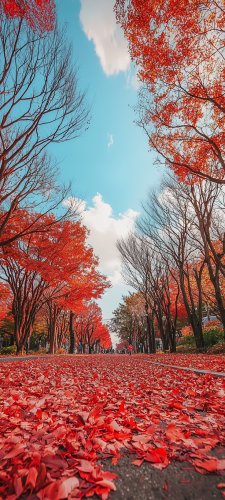 Autumn leaves in Japan, park with avenues lined with thick red leaves, blue sky, real photo, professional photographer with high-performance camera, --ar 9:20 --q 2 --v 6.1