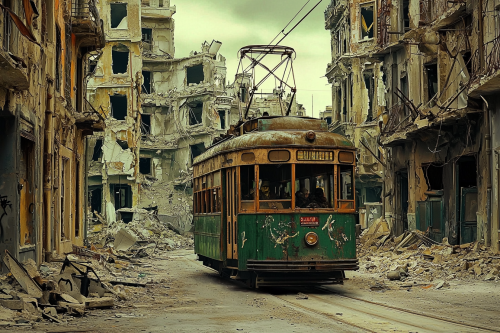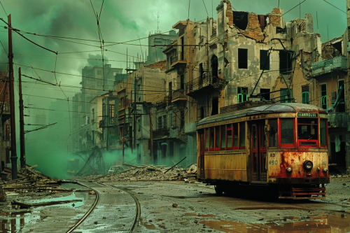 an old trolley car driving down a street in a small area, wwii, destroyed buildings on background, in the style of alejandro jodorowsky, photo taken with provia, historical reproductions, francis picabia, green and brown, karen knorr, electric color schemes, black and white --ar 3:2 --v 6.0
