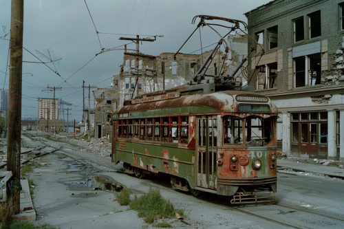 an old trolley car driving down a street in a small area, wwii, destroyed buildings on background, in the style of alejandro jodorowsky, photo taken with provia, historical reproductions, francis picabia, green and brown, karen knorr, electric color schemes, black and white --ar 3:2 --v 6.1 --q 2