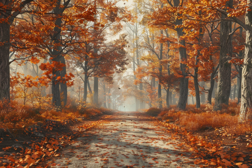 Autumn forest scene fiery orange and red leaves falling, soft sunlight streaming through the trees, a quiet path covered in fallen leaves, highly detailed textures, ultra-realistic, 8K. --v 6.0 --ar 3:2