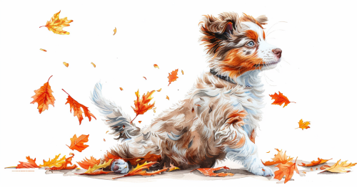 Strong wind blowing the fur of the tail of a red Merle Australian shepherd puppy. Autumn leaves are floating behind the puppy. Watercolor on white background, children’s book illustration, nursery wall art, on white background, 350 dpi, --v 6.0 --ar 17:9