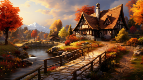 realistic, hd, desktop wallpaper, 1920×1080 px, landscape, magic, fall, scandinavian architecture, tudor-style village, farmland, pastures, farm animals, river, fantasy, autumn, red leaves, orange leaves, stone bridge over river, farm on the left, village townhouses on the right, --aspect 16:9