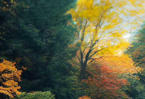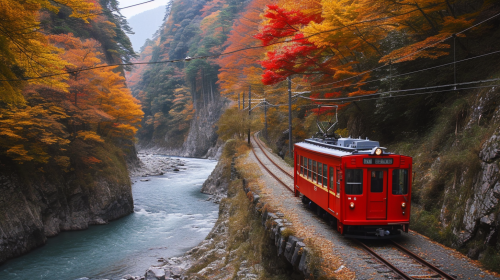 Kurobe gorge, autumn leaves, trolley --style raw --ar 16:9 --v 6.0
