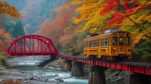 Kurobe gorge, autumn leaves, trolley, red bridge --style raw --ar 16:9 --v 6.0