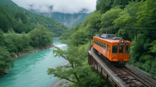 Kurobe Gorge, Trolley trip to unexplored areas and searching for spectacular views --style raw --ar 16:9 --v 6.0