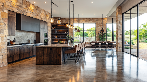 Design a photo showcasing a spacious kitchen with rugged stone walls and a large stone island at its center, complemented by sleek, dark wooden cabinets. Overhead, contemporary pendant lights made of recycled glass should hang, providing a modern touch to the rustic setting. The floor should be a polished concrete that reflects the kitchen’s ambient lighting, enhancing the natural textures. Include soft, plush seating around the island to add comfort and a touch of luxury. This image should perfectly blend the roughness of stone with the clean lines of modern kitchen design, attracting those interested in unique, earthy kitchen ideas. Camera: DSLR - Canon EOS 5D Mark IV. Lens: Canon EF 24-70mm f/2.8L II USM. Composition: Wide shot, room-centered, horizontal orientation, balance between furniture and space. Film: Digital, high resolution, color profile sRGB. Camera settings: ISO 400, f/2.8, 1/60 sec. --ar 16:9 --v 6.1 --s 250