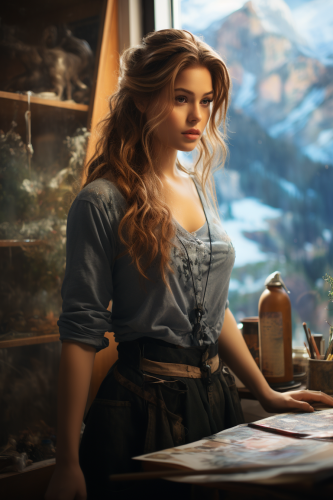 high quality photograph of Feyre from the ACOTAR series in front or an easel with a brush in her hand, working on a large painting in a spacious airy studio. She is wearing paint-smeared overalls. The view outside is a daytime fantasy city encircled by huge snowy mountains, Editorial Photography, Photoshoot, Shot on 70mm, Ultra - Wide Angle, Depth of Field, Tilt Blur, Shutter Speed 1/ 1000, Gamma, 32k, Super - Resolution, Megapixel, ProPhoto, Frontlight, Backlight, Rim Lights, Natural Lighting, Incandescent, Cinematic Lighting, Studio Lighting, Soft Lighting, Volumetric Lighting, Volumetric, Split Lighting, Beautiful Lighting, Accent Lighting, Global Illumination, Ray Tracing, Materiality, Ambient Occlusion, Scattering, Glowing, Glow - In - The - Dark, Shadows, Rough, Shimmering, Soft Body, Ray Tracing Reflections, Lumen Reflections, Screen Space Reflections, Chromatic Aberration, RGB Displacement, Scan Lines, Ray Traced, Ray Tracing Ambient Occlusion, Anti - Aliasing, Shaders, OpenGL - Shaders, GLSL - Shaders, Post Processing, Post - Production, Cel Shading, Tone Mapping, insanely detailed and intricate, hypermaximalist, elegant, hyper realistic --ar 2:3 --style raw --s 352