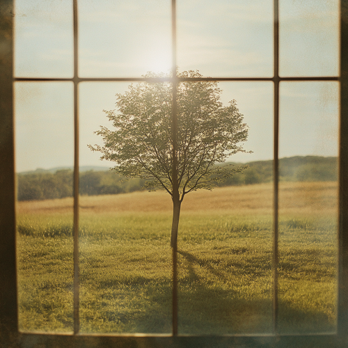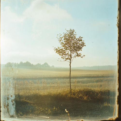 A young tree standing alone in the middle of a vast field, viewed through a glass pane in the foreground. The image has a film photography effect with high resolution, capturing the delicate details of the scene. Soft, backlit sunlight creates gentle flares and highlights, adding a warm and nostalgic atmosphere to the composition - ar 4:5, png