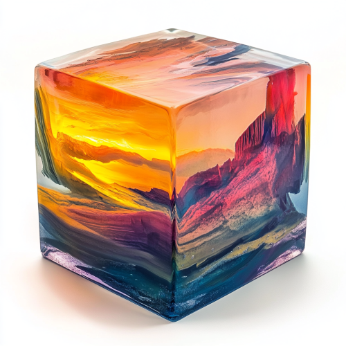 Psychedelic Sunrise over Arizona contained within a frosted opaque transparent glass cube form. Cinematic, moody lighting. White Background. Painterly in the style of Sargent and Joaquin Sorolla. Large bold brush strokes.