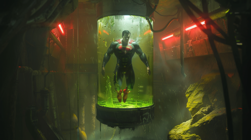 a wounded superman is floating inside a large glass tank full of green liquid in an underground cave lab, red led spotlights above, yellow stone, shadow and light, cinematic --ar 16:9 --v 6.0