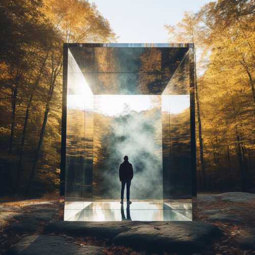 floating in open outdoors space, white, glass cube with a thousand transparent boxes stacked on top of each other, prism reflections from sun light rays behind, shining and reflecting through the glass. The overall design is made from multiple layers of glass material. It features an interactive installation and is presented in the front view. This artwork embodies the aesthetic style inspired by Japanese minimalism