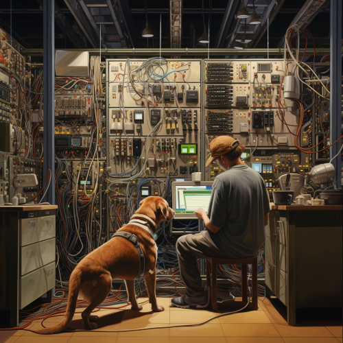 A large lab with an technician doing maintenance in electrical circuits, ultra realistic
