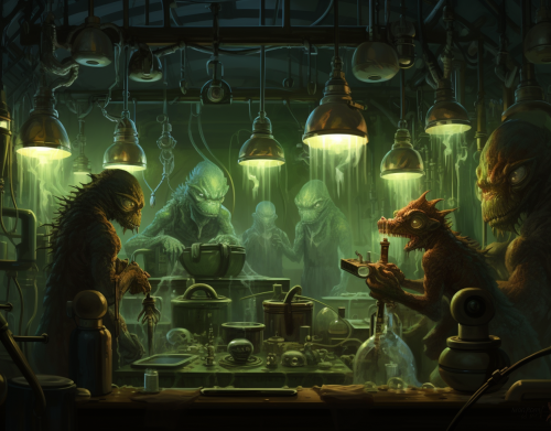 a well lit laboratory with a furry humanoid being examined by workers, greenish glow,fantasy illustration in the style of oil painting --v 5.2 --ar 9:7