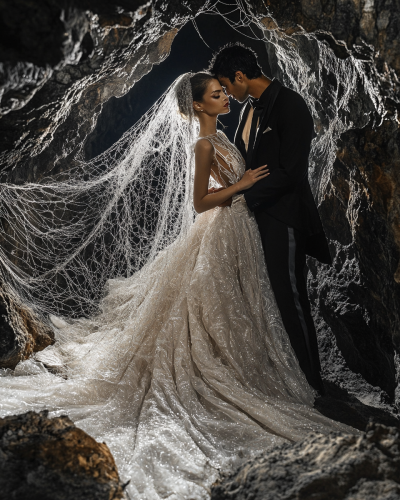 a high fashion editorial photo of a couple wearing wedding attire inspired by pearly spiderwebs, set in a very black cavern. Photorealistic. --ar 4:5 --v 6.1