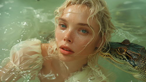 girl sitting on a crocodile, lacoste sneakers, fashion photography featuring sartorial preppy sportswear, minimalism, she is standing on a crocodile in an uninhabited house and wearing crocodile clothing, high fashion editorial, vogue, in the style of polixeni papapetrou, stanley kubrick, light green, kathryn morris trotter, sony alpha a1, woven/ perforated, 20th century scandinavian style --ar 16:9 --v 6.0 --s 750
