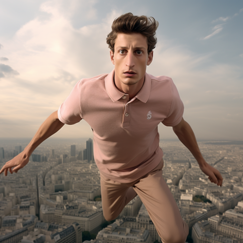 Pierre Niney flying elegantly in the sky over Paris in a high fashion creme polo Lacoste, super wide shot, high definition, DOF, 8K, color grade, huge ligthing, huge render, photorealistic, cinematographic, high detailed, color palette is dark and warm, editorial photo