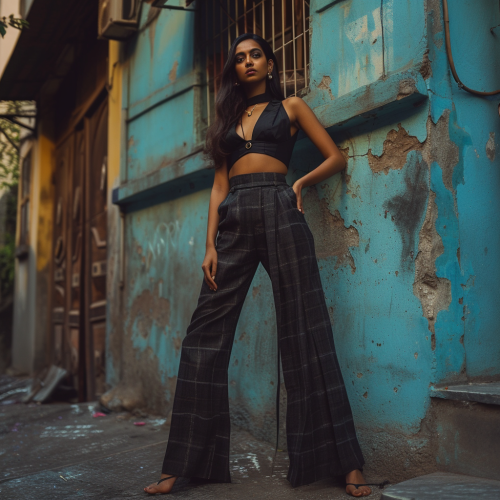 Fashion-forward Indian woman, urban setting, street style, high-waisted trousers, high fashion editorial, Sony A7R IV --v 6.0