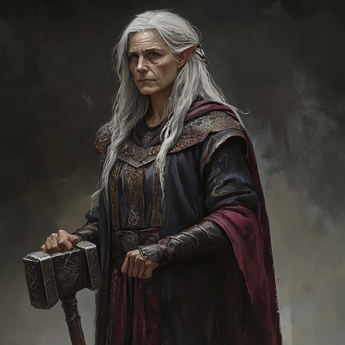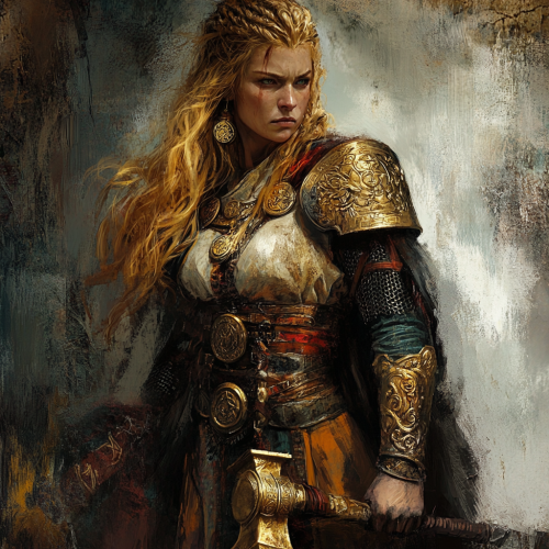 older dwarf woman, cleric, body similar to Lord of the rings Dwarf, in the style of oil painting, cleric of freya lady of fire and goddess of war, shield maiden, green eyes, blond hair braided into a viking style, wielding a warhammer, healer