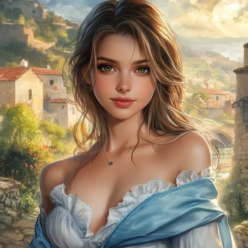 A beautiful young lady in her early twenties, looking youthful and charming. Straight, hazelnut brown hair with a long strand on her right haning down. Greenish brown eys. Semi long pinted noise. A pointy V shaped face with a healthy blush. Natural full lips. She is wearing a blue baret and a white top with a silk scarf. In the background, an old quaint South European village. The twilight hours of a sunset.