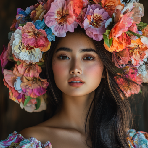 mid 30s beautiful brown filipina lady, artistically dressed in flowers, abstract, etheareal, artistic, 8k, elegant design, warm, colorful, midsommar vibes