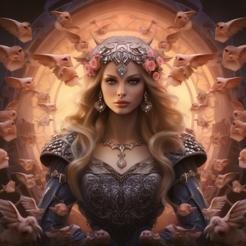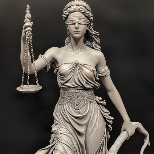 She is a statue of Lady Justice with a very beautiful face. The details are so intricate that it looks like a real photograph. She is facing the camera directly. She is wearing a silk dress that partially covers her chest. She has long hair, and each of her ears is adorned with a feather. She has one leg extended, with a snake wrapped around it. In one of her hands, she is holding a scale.