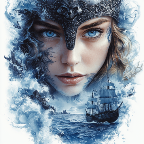 Realistic drawing-style tattoo design of the Norse goddess Freya, with blue eyes and long hair, wearing a Viking helmet, set against a background of a Scandinavian fjord scene with a Viking ship in the water, surrounded by ocean waves. The color palette is limited to light grey and dark cyan on a white background. --v 6.1 --s 750 --style raw