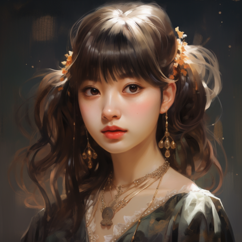 Dutch braid, brown hair, with blunt cut bangs, lazy style, oily painting style, face up, only show upper body, details in hair, smooth, beautiful asian lady, with sparkly and simple hair accessories