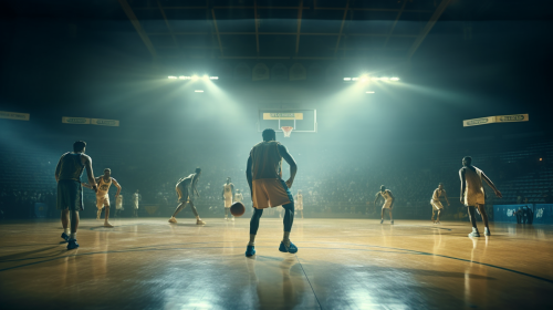 Basketball players playing in a full stadium, yellow team against another light blue team, cinematographic composition, cinematic Film still, NBA style, dark cinematic light, Shot with 50mm lens, Shutter speed 1/1000, F/22, White balance, 32k, sharp focus, epic composition, Super resolution, ProPhoto RGB, sharp focus, VR, high, epic, artgerm, alex ross, 8k, vogue editorial, cinematic, lighting, realistic, 100 megapixels, high resolution editorial, rule of thirds --ar 16:9 --upbeta --s 750 --v 5.0