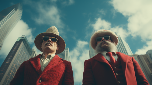 Eccentric and Quirky characters dressed in Christmas attire exploring the sights of downtown New York City. Meticulously arranged minimalist symmetrical festive backdrop. Snow. White and red fuzzy Santa hats. Red and green festive attire. Holiday scenery. Vintage feel. Retro feel. Extreme blue skies. Presented in geometric art style. Extreme low angle camera shot. Looking straight up. High-end. Stylish. Black and white with color splash. Clean lines. Shot with a Pentax. K-3 III Monochrome. --ar 16:9 --q 0.5 --s 750