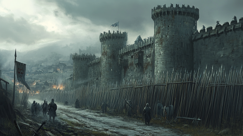 painterly Concept art medieval fantasy wide shot surrounded by a twelve-foot-high palisade1, with guards peering over the walls, ever watchful for any signs of danger. The walls are made of sturdy wooden stakes, sharpened at the top, giving the city a fortified and somewhat ominous appearance. The sky above is often overcast, casting a gloomy shadow over the landscape The city within the walls is a mix of old, weathered buildings and narrow, cobblestone streets, with the occasional flicker of torchlight illuminating the dark corners. --ar 16:9