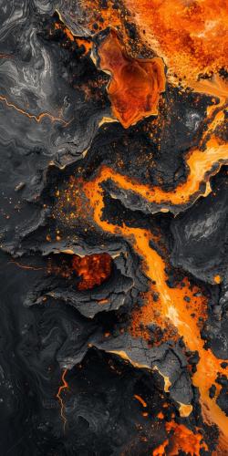 a black rock, fire, and water, in the style of layers of paint, uhd image, industrial materials, glossy finish, dark orange, aerial view, eye-catching detail --ar 1:2 --v 6.0