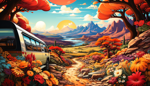 Epic landscape at sunset. Foreground of low, semi-alien plants opens into luscious desert world, minor or no water elements, plants but no animals, subtle hidden mushrooms in image. high contrast between colors, high details, high definition, bold lines, emotive fields of color, psychedelic landscape. mainly orange, yellow, red and pink pastel colors but with accents of electric blue and green, very high contrast --ar 7:4 --no humans or people --stylize 800 --weird 18 --chaos 20