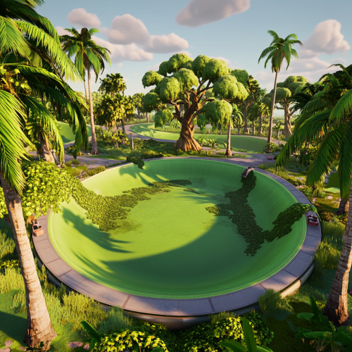 large, football field size, circular roller derby rink, outside, field is green, everglades,palm trees, oak trees with spanish moss, alligators, early evening, rendered in style of fortnite