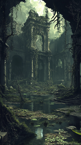 The Forsaken Sanctuary An abandoned, overgrown temple in the heart of a sinister, dark swamp. The once-grand structure is now crumbling and choked with twisted vines and fungi, while ghostly figures and eerie, bioluminescent creatures drift among the ruins and murky waters. --ar 9:16