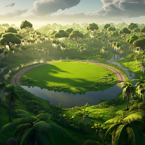 large round football field, green swamp in center, covered in short green grass, Everglades, palm trees, oak trees with spanish moss, early evening, rendered in style of fortnite