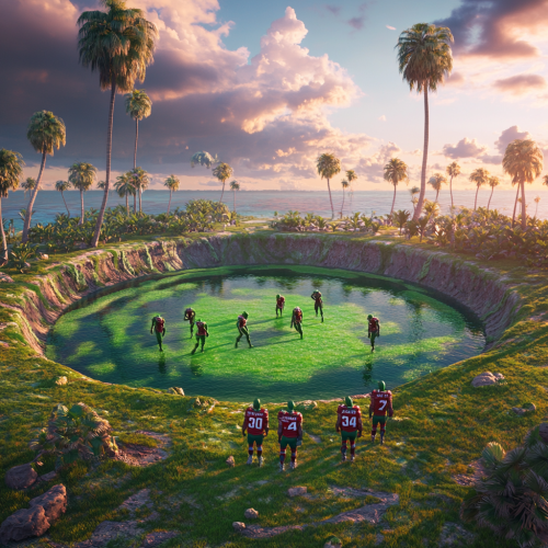 massive round football field/ roller derby, short green grass, large hole in center filled with lime green water, Everglades, palm trees, oak trees with spanish moss, sunset, ocean in distance, green swamp monsters wearing red american football jerseys walking onto field from center, large storm clouds in distance, rendered in style of fortnite