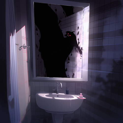 A low-resolution surveillance camera monitor image showing the entrance of an apartment building at night. Despite the late hour, a figure resembling a person appears in the footage. The figure is entirely black, with only its eyes visible, glowing white. It seems to have a faint, unsettling smile, but the low resolution of the monitor makes it hard to see clearly. The scene is eerie, with the dimly lit entrance and the shadowy figure creating a sense of unease. The image has a grainy, low-quality look typical of old security camera footage, enhancing the creepy, mysterious atmosphere.