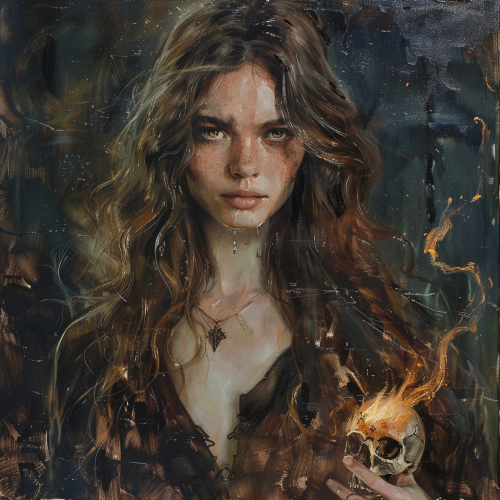 dark fantasy, painted portrait, a girl with brown wavy long hair, she had golden eyes, she has a flame spell in her left hand and a skull in her right hand, she’s wearing a brown tunic --v 6.0