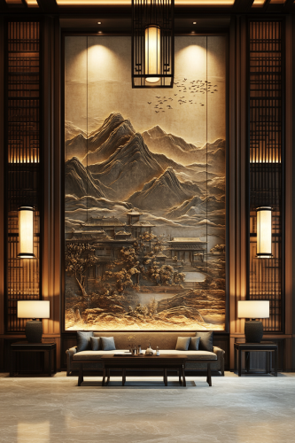 The hotel lobby wall is dominated by Chinese landscape relief, high-end atmosphere, large area relief carving, warm lighting, traditional elements into the decoration, rich details, symmetrical composition, natural color. --ar 85:128 --v 6.1