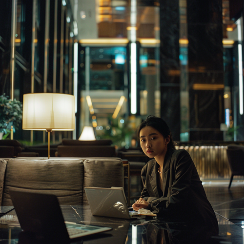 asian business woman working in the lobby in a 2023 modern hotel room, 35 mm lens