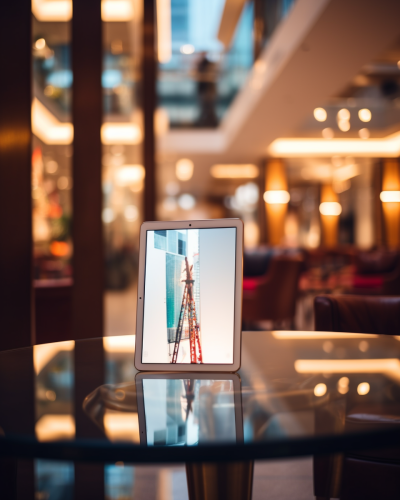 a medium shot photograph of an LED large ipad (vertical) floating mid-air in a (blurry background; abstract background). the ipad is perfectly designed with rounded edges in apple style. the lobby has excellent indoor lighting, from partial sunlight overhead. clean space, abstract vibe. --ar 4:5